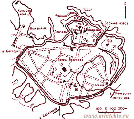 Город Ярослава охватил большую территорию (около 80 гектаров) нагорной части Киева, превышавшую город Владимира почти в восемь раз. Возводится новая оборонительная линия - мощные валы с бревенчатыми стенами достигали высоты 14-16 м. В окольный город, каким по сути являлся город Ярослава, вели трое ворот, выводивших на основные дороги в Белгород, Васильков и Печерский монастырь. Новый город, защищенный валом, включил в свои пределы вал Владимира Святого, а также и Михайловскую гору, на которой стоял сначала Дмитриевский монастырь (XI в.), а затем златоверхий Михайловский монастырь (1108 г.). Посреди нового Кремля высился величественный Софийский собор в Киеве (около 1037 г.), рядом с ним монастырь Ирины (начало XI в.), а немного севернее — Георгиевская церковь (XI в.).